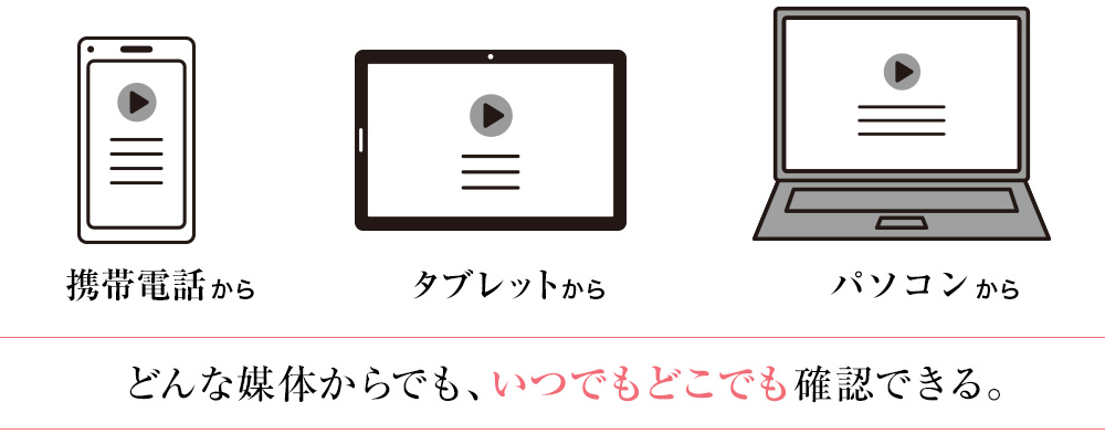 携帯電話やパソコンはもちろんのこと、タブレットなど、ネットに接続可能な端末であればいつでもどこでも情報を確認できるため、情報共有の時短と生産性向上の実現へ大きく貢献致します。