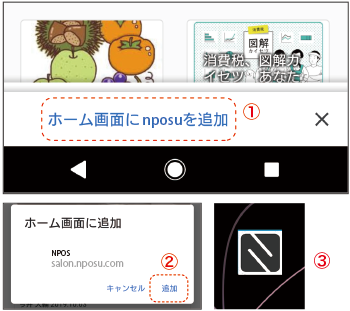 アンドロイドユーザーの方は、一度ブラウザ上でログインした後に、『ホーム画面にNPOSUを追加』を選択することで、端末のホームにNPOSUのアイコンが追加でき、アプリと同様に簡単にアクセスが可能です。
