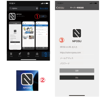 iOSユーザーの方は、App Storeから「NPOSU」と検索①し、アプリをダウンロードしてください。